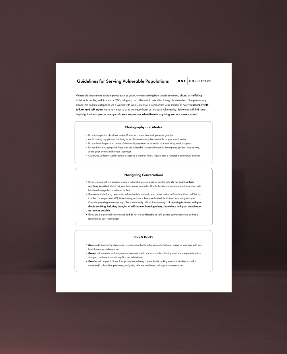 Evan Wise 7/13/23 Evan Wise 7/13/23 Engaging in Healthy Team Conflict Read More Evan Wise 4/12/23 Evan Wise 4/12/23 What to Expect When Returning Home (The 5 F’s) Read More Evan Wise 3/14/23 Evan Wise 3/14/23 Re-Entry & Debrief Packet for Short-Term Workers Read More Evan Wise 2/28/23 Evan Wise 2/28/23 One Collective Logo Files Read More Evan Wise 2/23/23 Evan Wise 2/23/23 Guidelines for Working with Vulnerable Populations Read More Evan Wise 2/23/23 Evan Wise 2/23/23 Suggested General Packing List Read More Evan Wise 2/23/23 Evan Wise 2/23/23 Fundraising Sample Letter Read More Evan Wise 2/14/23 Evan Wise 2/14/23 Spirituality of Fundraising (Excerpt) Read More Evan Wise 2/8/23 Evan Wise 2/8/23 Pre-Field Communications Security for Staff Heading to Sensitive Locations Read More Evan Wise 2/8/23 Evan Wise 2/8/23 Ministry Development Manual Read More Evan Wise 2/8/23 Evan Wise 2/8/23 Cross Cultural Servanthood Read More Evan Wise 2/8/23 Evan Wise 2/8/23 Printable Giving Response Cards Read More Evan Wise 2/8/23 Evan Wise 2/8/23 FAQs For Finances Read More Evan Wise 2/8/23 Evan Wise 2/8/23 Building Your Support Team Read More Evan Wise 2/8/23 Evan Wise 2/8/23 Philosophy of Ministry Read More