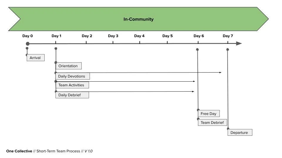 In-Community: Arrive, orient, engage community/team, debrief, depart.
