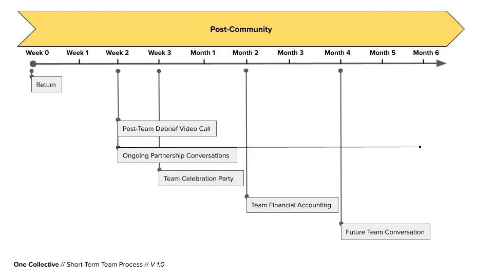 Post-Community: Return home, debrief, partnership, and account funds.